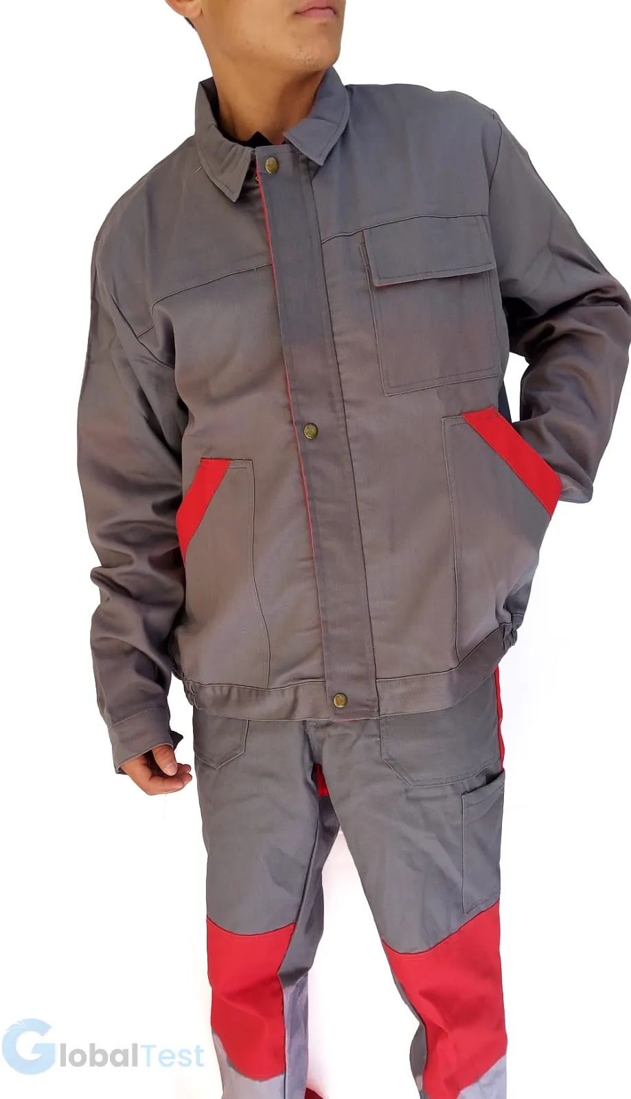 Cet ensemble professionnel bicolore (gris et rouge) est constitué d’une veste et d’un pantalon assortis, conçus pour répondre aux besoins des travailleurs exigeants.